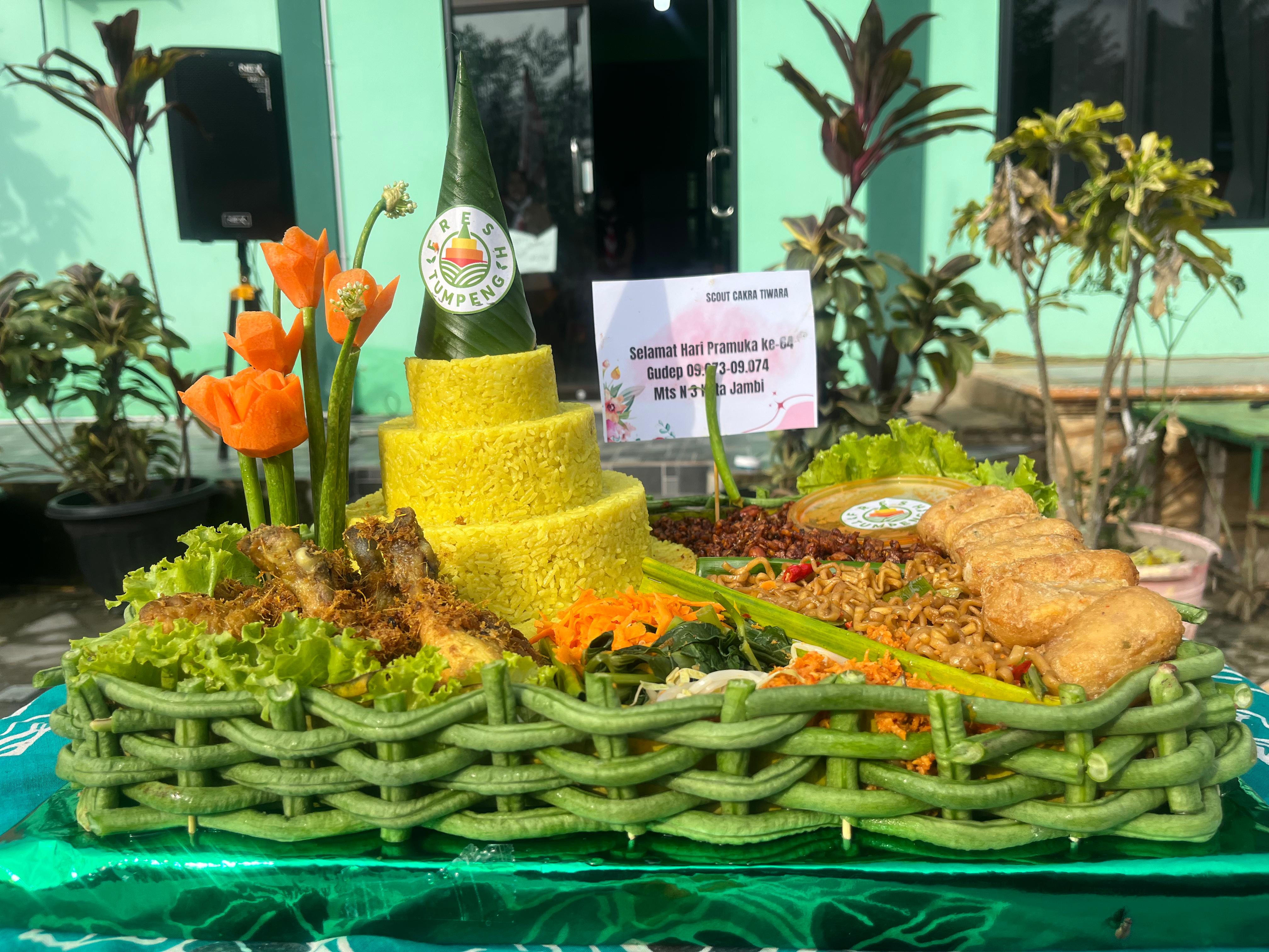 Sebagai wujud syukur dan kebersamaan, panitia kemudian menggelar potong tumpeng di halaman madrasah. Tumpeng yang dipotong oleh Kepala MTs N 3 Kota Jambi diserahkan simbolis kepada perwakilan penggalang dan guru senior. Suasana haru dan riang bercampur ketika doa dipanjatkan untuk kelancaran kegiatan dan keselamatan seluruh civitas MTs N 3 Kota Jambi. Potong tumpeng bukan sekadar tradisi kuliner, melainkan simbol rasa terima kasih dan harapan agar nilai-nilai kebersamaan terus hidup di lingkungan sekolah.