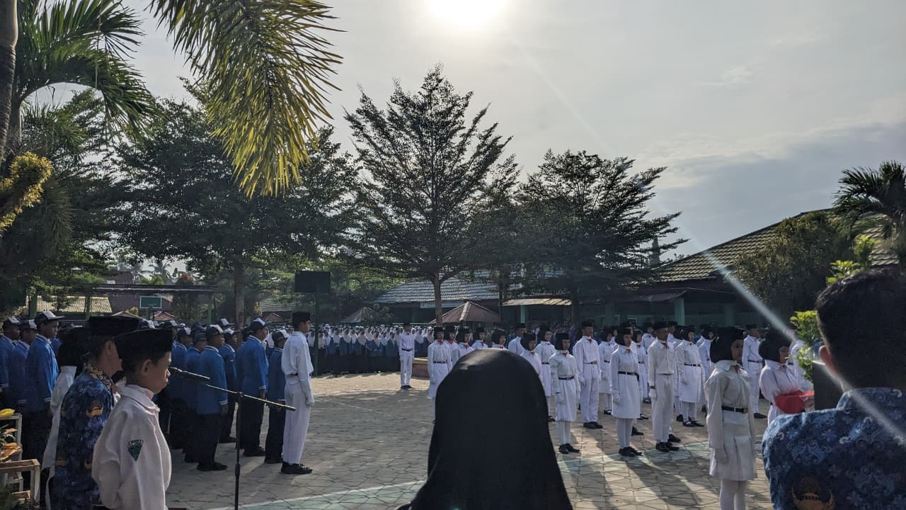 Kota Jambi – Minggu pagi (17/08/2025), langit cerah menaungi lapangan MTs Negeri 3 Kota Jambi. Sejak pukul tujuh, barisan siswa telah berdiri rapi dengan seragam putih biru dan jas biru kebanggaan siswa. Para guru dan pegawai tampil berwibawa dengan seragam Korpri, menambah kekhidmatan suasana. Di bagian belakang barisan, anggota Palang Merah Remaja (PMR) tampak siaga, bersiap bila ada peserta yang membutuhkan pertolongan.