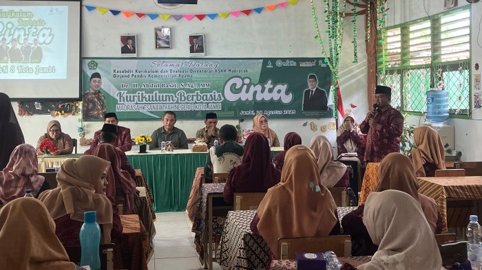Kota Jambi – Seusai tampil sebagai narasumber dalam program Siniar Masanta, Dr. H. Abdul Basit, S.Ag., M.M., Kasubdit Kurikulum dan Evaluasi Direktorat KSKK Madrasah Kementerian Agama Republik Indonesia, melanjutkan agenda penting di MTs Negeri 3 Kota Jambi. Pada Kamis (28/8/2025), beliau memberikan pengarahan khusus kepada seluruh guru madrasah tentang pentingnya implementasi Kurikulum Berbasis Cinta (KBC).