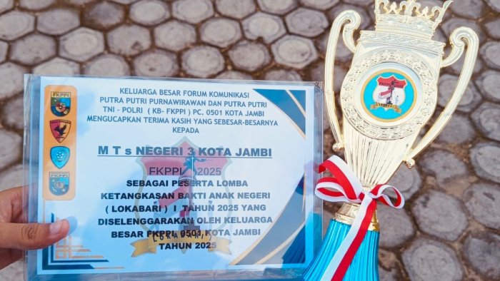 Kota Jambi, MTsN 3 Kota Jambi kembali menorehkan prestasi gemilang dengan meraih Juara 1 dalam Lomba Ketangkasan Bakti Anak Negeri (LOKABARI) I Tahun 2025 tingkat SMP/MTs se-Kota Jambi. Kegiatan ini diselenggarakan oleh Pengurus Cabang Keluarga Besar Forum Komunikasi Putra Putri Purnawirawan dan Putra Putri TNI-Polri (KB-FKPPI) 0501 pada Sabtu, 30 Agustus 2025, bertempat di Gedung Juang DHD 45 Provinsi Jambi.