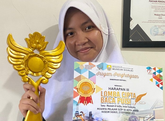 Kota Jambi, Museum Siginjei menjadi saksi kreativitas generasi muda dalam Lomba Cipta dan Baca Puisi tingkat SLTP, Selasa (23/9/2025). Lomba ini dikuti oleh 50 pelajar se-Kota Jambi. Naqiya Zivana, siswi MTsN 3 Kota Jambi berhasil meraih Juara Harapan 3 berkat karya dan penampilannya yang memikat.