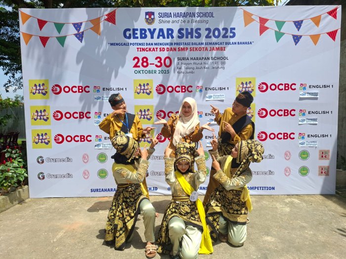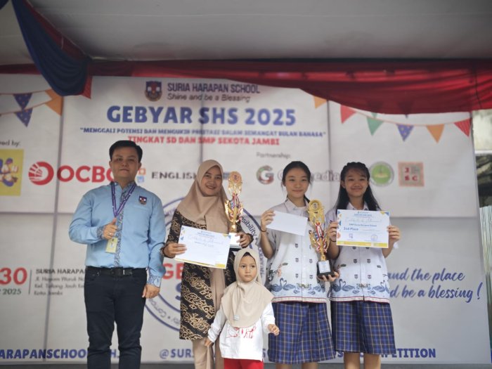 Kota Jambi - Tim Tari MTsN 3 Kota Jambi berhasil meraih Juara 1 Tingkat SLTP se-Kota Jambi dalam cabang Lomba Tari Kreasi pada ajang Gebyar SHS 2025 yang diselenggarakan oleh Suria Harapan School pada Rabu (29/10/25). Dengan mengusung tema "Menggali Potensi dan Mengukir Prestasi dalam Semangat Bulan Bahasa". Kegiatan ini menjadi ajang inspiratif bagi para pelajar Kota Jambi untuk menampilkan kreativitas dan potensi terbaik mereka di bidang seni.