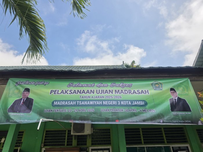 Hari pertama pelaksanaan Ujian Madrasah Tahun Ajaran 2025/2026 resmi dimulai pada Rabu, 22 April 2026. Kegiatan ini menjadi salah satu tahapan penting dalam proses evaluasi akhir bagi siswa kelas IX di MTsN 3 Kota Jambi. Pelaksanaan ujian berlangsung dengan tertib dan lancar sesuai dengan jadwal serta ketentuan yang telah ditetapkan oleh pihak madrasah.